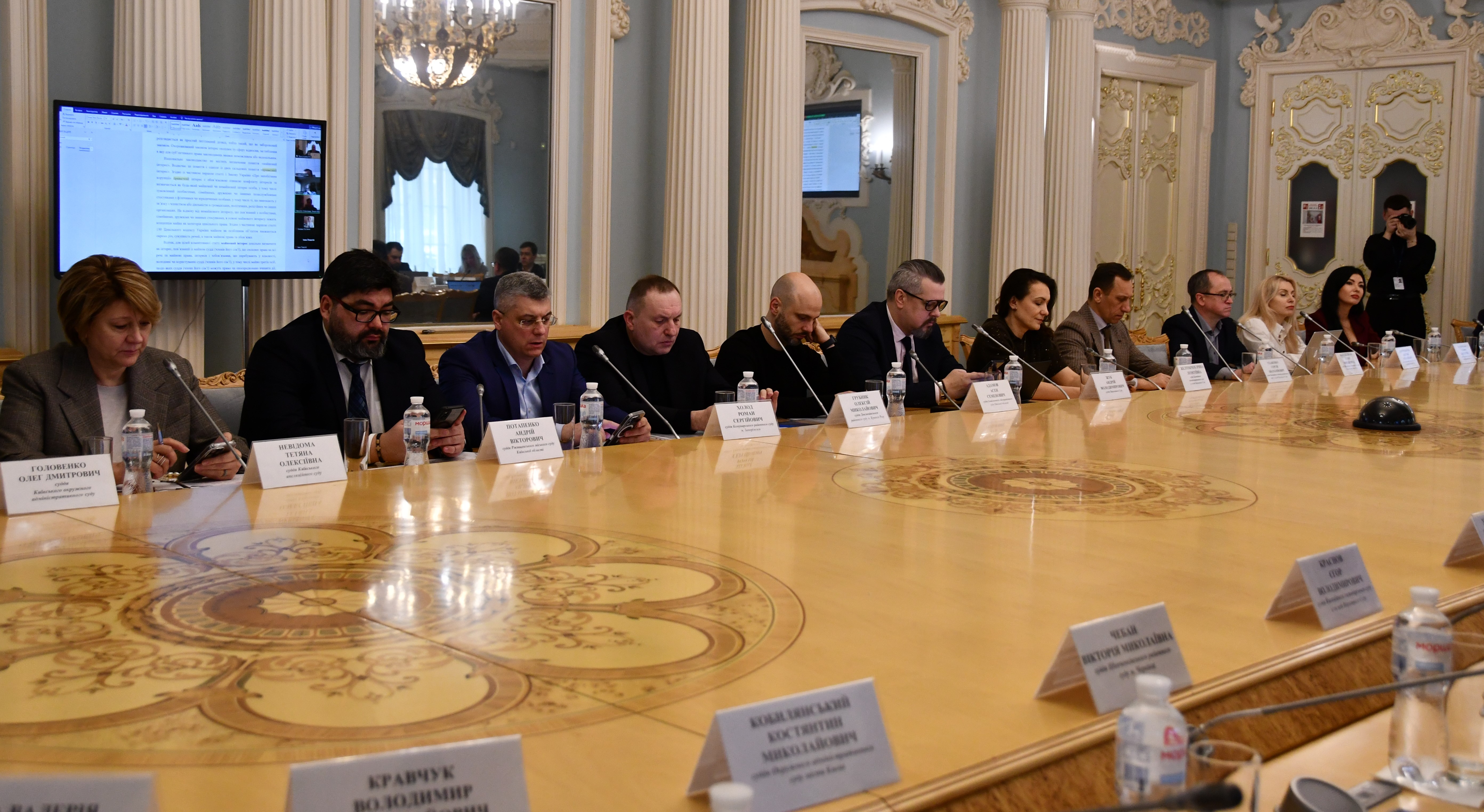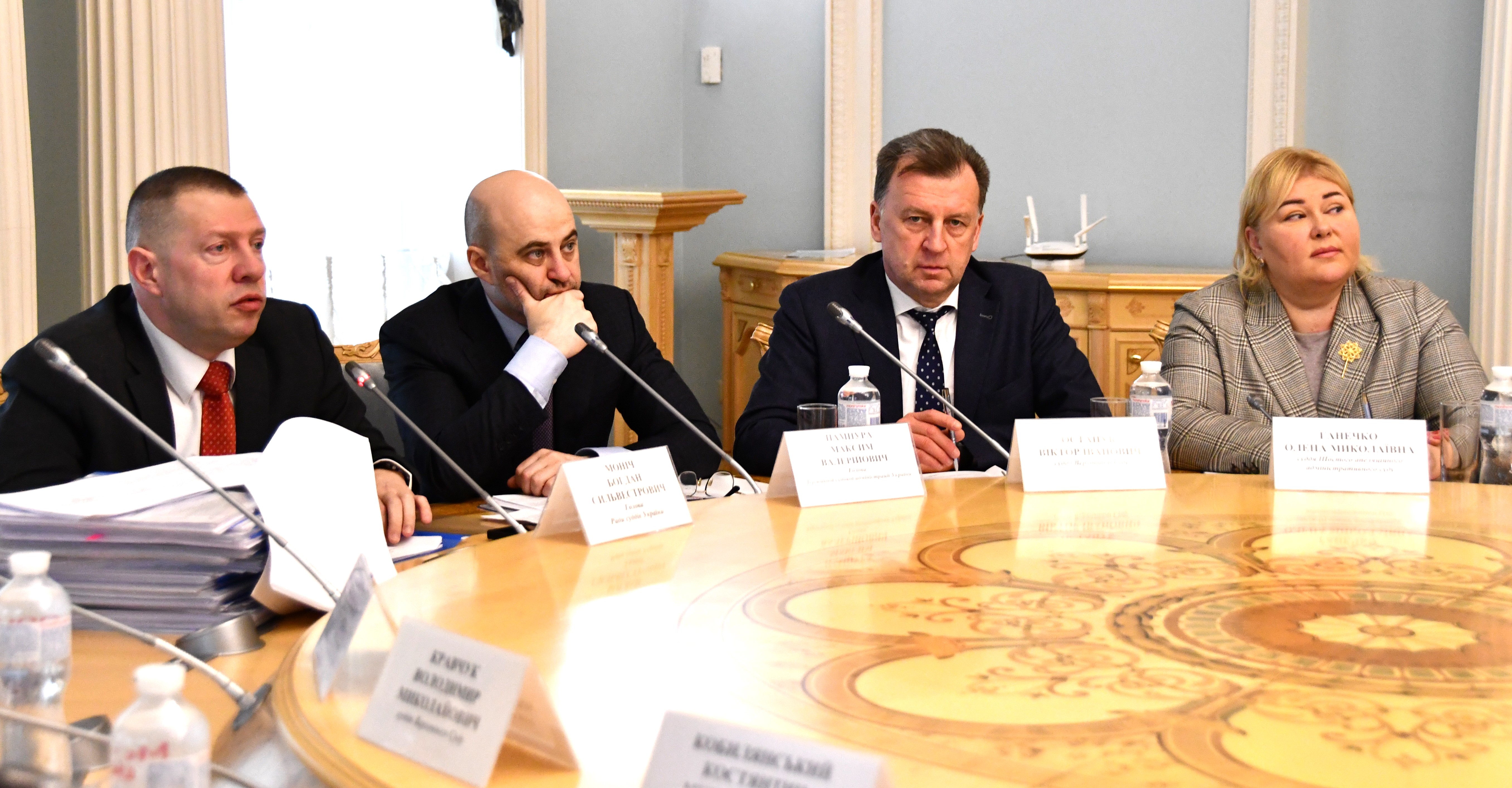 "Сподіваюсь, що ця робота буде корисною для усієї суддівської спільноти. Щиро хочу подякувати за неї членам робочої групи, які присутні на засіданні в цій залі і тим, хто з нами на відеоконференцзв'язку, і членам Ради суддів України, які активно долучилися до підготовки Коментаря, представникам громадських організацій, які також не були байдужими до цього процесу, власне усім, хто застосовував свій досвід та знання щоб створити досить детальний посібник ддля використання в роботі не тільки суддями, а й тими, хто прагне долучитися до суддівської професії", - сказав Голова Ради суддів України Богдан Моніч, представляючи перше питання порядку денного засідання.